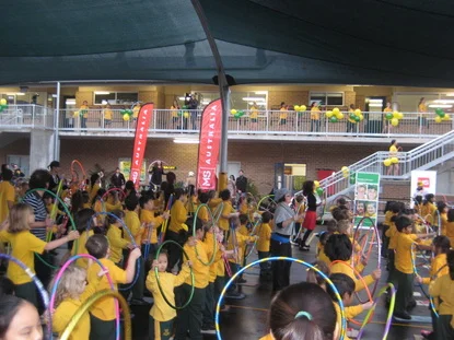 The sight of 400 primary school students at 7am high on orange pineapple juice from the fundraiser breakfast, trying to be marshalled into organised lines was highly amusing. But as the opening bars played, the kids knew exactly what to do and shimmied, sashayed and bopped with their hoops, smiling for the Sunrise TV cameras and keen parents taking photos.